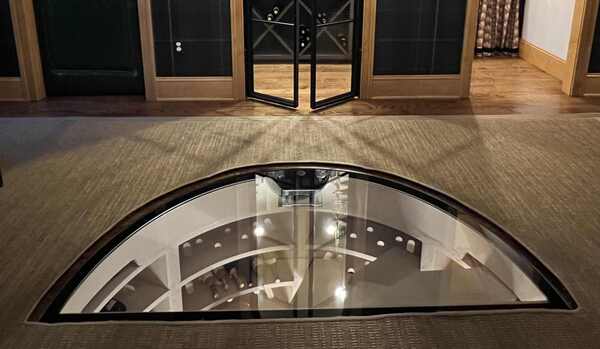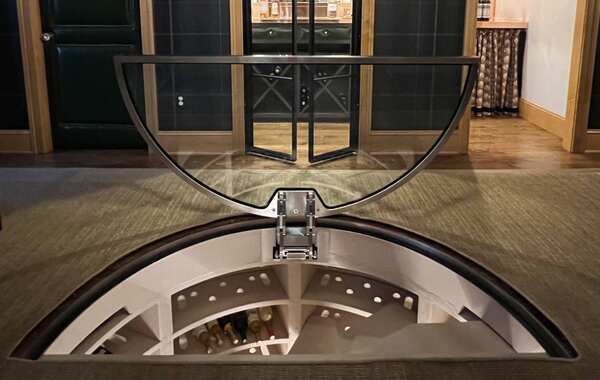 Conçue pour intégrer harmonieusement l'espace de la pièce, cette cave est à la fois esthétique et fonctionnelle. Visible à travers un vitrage au sol, elle s'inscrit comme un véritable bijou d'architecture, offrant une vue plongeante sur les étagères soigneusement disposées en spirale.